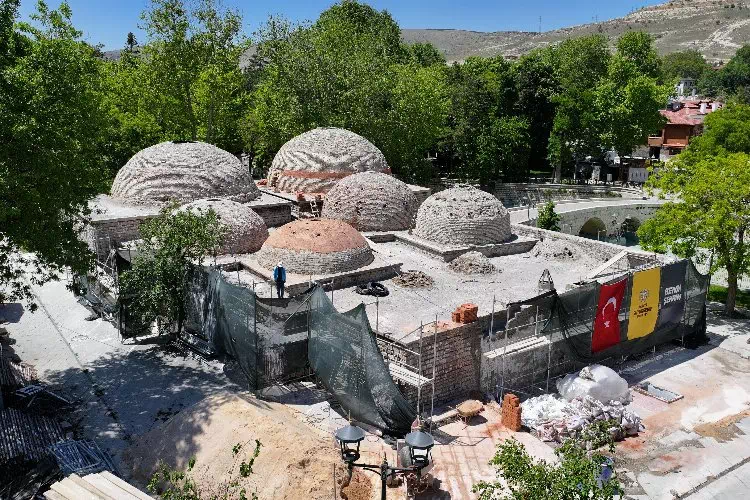Konya Büyükşehir Belediyesi Tarihi Meram Köprüsü yanındaki Karamanoğlu Mehmet Bey Hamamı’nda restorasyon çalışmalarına aralıksız devam ediyor