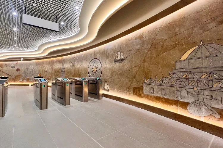 Türkiye’nin dünyaya örnek ulaşım projeleri, İstanbul’un eşsiz boğaz silüeti, simge yapılarının yanı sıra Türk kültürü, dönemin önemli tarihi yapıları gibi birçok elementin yer aldığı tasarımlarda, yolculara şehri adeta yer altında yaşama imkânısunan metro hattında minimalist ve modern bir tasarım kurgulandı.